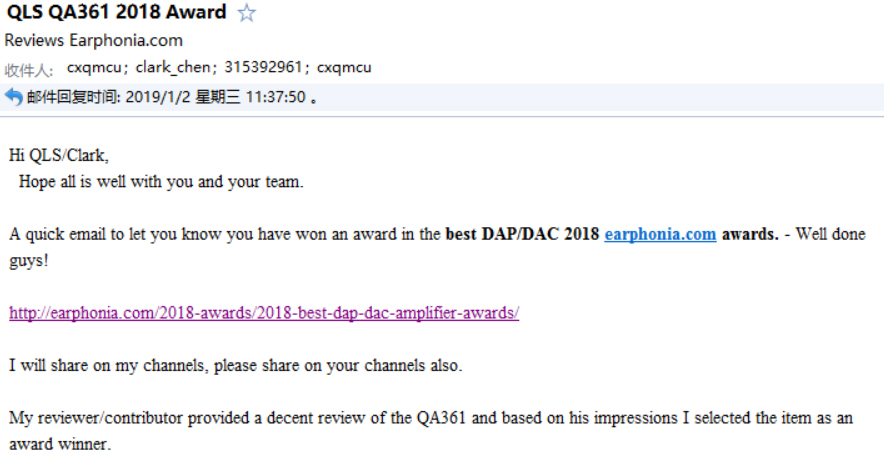 早上收到一封英文郵件,大概意思是QA361獲獎了,也不知道是啥獎,一個從來沒有接觸過的國外媒體,感謝他們能夠認可QA361并給我們機會,給一個從來沒有聯(lián)系過的來自中國的一家小公司的產品一個機會,非常感謝!