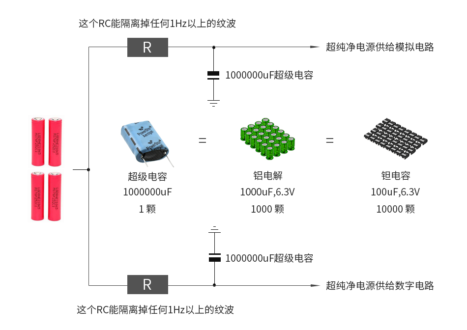 雙1000000uF低內(nèi)阻超級電容加持為數(shù)字與模擬部分隔離供電,類似臺機(jī)的雙牛設(shè)計 |