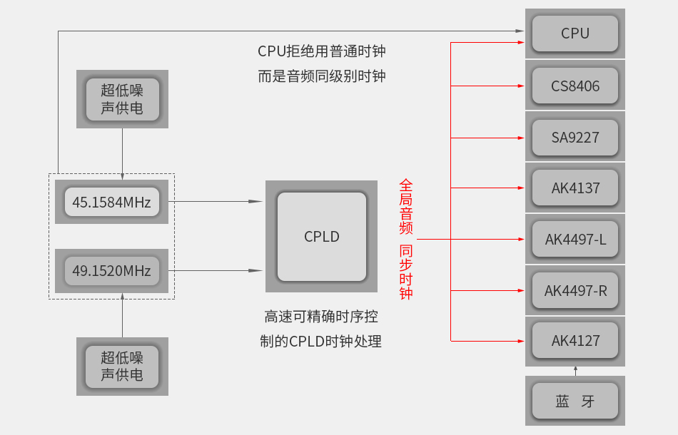 參考dCS單體式時鐘同步供應(yīng)設(shè)計,全局來源于雙飛秒時鐘,相當(dāng)于音源和DAC之間用了時鐘同步功能 |