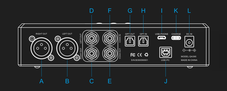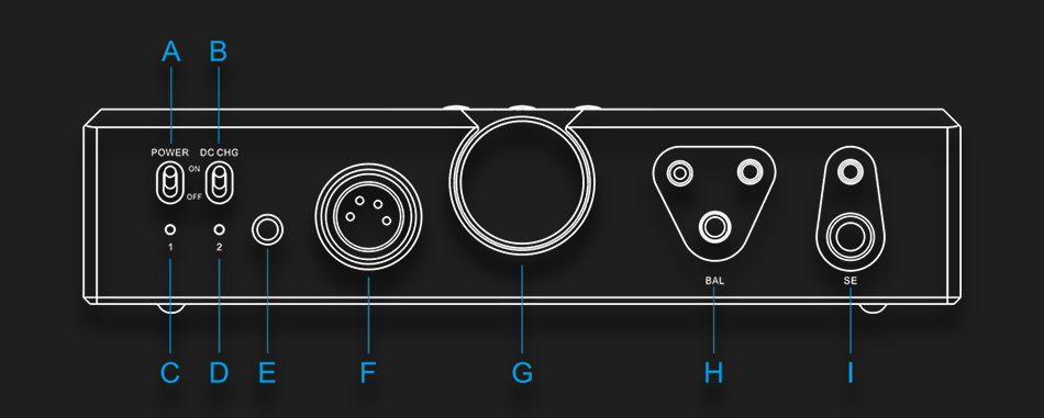 A - XLR平衡輸出右(R)聲道 G - 光纖數(shù)字輸出 |